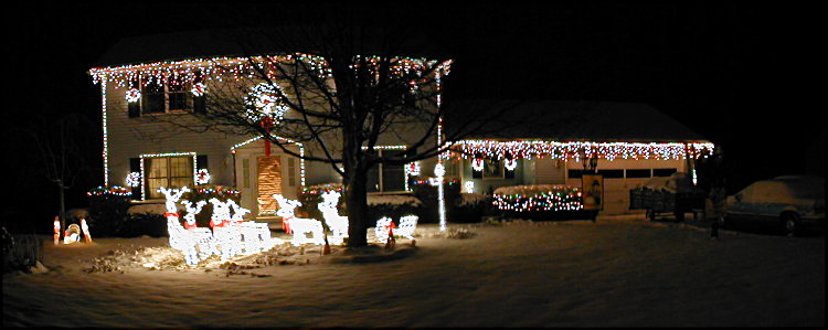 Anyway, weather not withstanding, I did manage to get some outdoor work done today. I did find that a lot of my time was consumed assembling some new wireframes, but at least I could do that inside where it was warm <grin>. After assembling 7 new display peices, I hit the outdoors, and worked on the lights on the shurbs on the left side of the yard, behind the roadside shrubs, and for the big maple tree in the center of the front yard. I decided to do a trunk & branch wrap this year, and it took quite awhile to wrap the 1,750 lights on the branches. I then hung the 10 100 light gold balls from the tree to complete the tree for this year. That's a total of 2,750 lights on the maple tree alone. Here's what the yard looks like as of tonight: