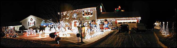 Oops, I never sent the update from last weekend to the website... Sorry.... Ok, back to work again this weekend. The weather today was certainly better than the forecast.... We were supposed to get 6-12" of snow during the day, but the temps stayed in the upper 30's, and we had on/off rain instead.... Got drenched at times trying to work, but still got quite a bit done in the 7-8 hours I was working on things. Today, I got out the remainder of the functioning old wireframes, a new animated wireframe angel. I have 3 more of these to assemble, too! I moved the holographic snowman and package to new locations and filled out the lawn with the majority of the decorations. I still have a few finishing touches to the lawn for tomorrow, along with the 3 other animated angels, plus a few new ideas for the left side of the house that shows as people are driving down the road towards the house. I decided to not put up the big tree (25') on that side as I have done in the past.... It's just too hard to get a good tree, and find the help to put it up. I've got some new ideas to work on tomorrow. Today, I also got the new inflatable Santa/Sleigh/Reindeer up on the garage roof along with a new wireframe wreath and a climbing Santa blow-mold on the right-side wall of the house. Here's what things look like from two perspectives, from the right and from the left sides of the property.