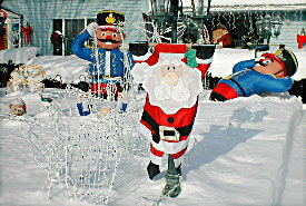Ok, so I forgot to update the website yesterday (12/7).... It was a rotten weekend again for decorating.... Yesterday wasn't as bad as today, but the first thing I had to do was to snowblow the lawn to find the grass to be able to stake the lawn decorations I got out.... Saturday was mostly a blow-mold day, as I got out most of the blow-mold decorations (22 of them). I also got 3 of the giant inflatables out, 2 new soldier boys and the snowman from last year. I also got the lights on the weeping cherry tree, and rebuilt the old plastic nativity star for the cherry tree. I moved the wireframe star over to a post over the kneeling santa nativity. I also got the wireframe present out, and placed it in Santa's wireframe sleigh... Since I didn't even get started decorating until after 1pm... It was at least warmer on Saturday.... Today was another story, however.... It started getting colder almost as soon as I got started.... Snowed later in the day, and we had several windy snow squalls that made decorating miserable at times. I still worked on thru the day, and got the tree on the front porch, and the 7½ foot tall Santa on the porch as well.... Along with the new snowflake lights and the star lights on the tree....