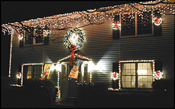 The weather was nice, but due to other demands, I was unable to start on the decorating until noon, and had to take an hour offin the afternoon. So, I did not get as much done today as I had hoped for. I got all 10 lighted wreaths on the shutters, the big 5' wreath above the door with the "JOY" emblem in the middle, the red and green house trim lights, the red & frosted white icicle lights. and some new stuff: red & blue house trim lights on the porch/garage, and lighted Santa, Snowman & Bear windsocks on the garage. Here's a few pictures of the house as of tonight:
