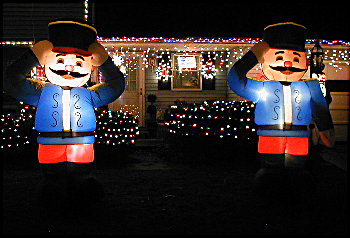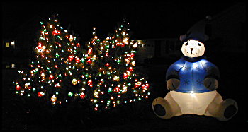 The snowman is actually sitting on our neighbor's lawn! It started rain a little harder again so I had to take another break, but got back out to put the lights on the shrubs by the Polar Bear, both the regular mini-lights and the lighted 4" balls. I think it came out better this year than last year. After that, I started to set up the inflatable Nutcrackers/Soldiers, and about half way through the second one, it realy started to rain. I finished up, got soaked, and called it a day. Had to wait for the rain to stop to take the pictures for tonight, but it finally stopped.
