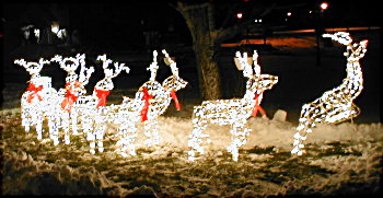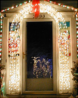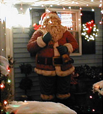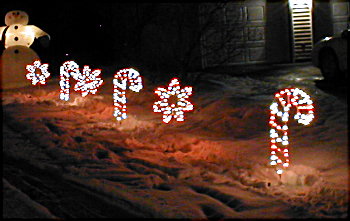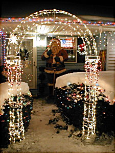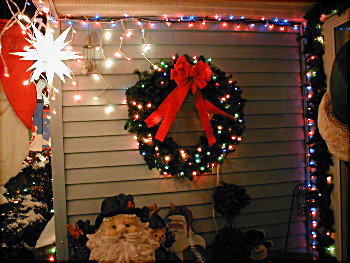 As you can see by the pictures, by the time I took them at about 7pm, we already had over a foot of new snow on the ground. As of Monday morning, the total was 18" of new snow. This, along with a forcast of another storm on Wednesday night and Thursday will probably makeit impossible to do much more deocrating outside this season. I had hoped to put some lights on the maple tree, and may still do so. However, the pathcicles along the driveway, and any more wireframes on the lawn are probably out of the question since I can't find the ground to put them on!!