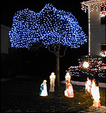 Anyway, I did get the blue net lights on the weeping cherry tree this afternoon. Boy, that tree is getting big, it went from 1000 total lights last year to 1,650 net lights alone. I still have to put up the icicle light "fringe" around the bottom to get rid of the smooth bottom edge you get from the net lights. I figure that will be around another 400-500 lights.... It took me almost 3 hours just to get the lights on that tree alone today!