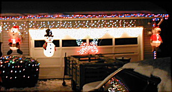 I was certainly hoping to get alot more accomplished today, but the snow and wind made it very cold outside. Wind chills this afternoon were around -20°. And the constant snow falling made it very difficult to work on anything. I only managed to add a total of 1,515 lights today for a new grand total of 12,493 so far. The weather is supposed to be better tomorrow, so hopefully I will be able to get more done. I have to find some time to get to WalMart or Home Depot to get some supplies and light bulbs to fix up some of the stuff already outside, too! But, here's what we look like as of tonight: