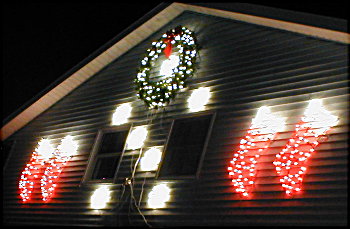 After giving up on the ball lights and the maple tree in general for now, I decided to finish the trim on the garage and the poinsetta & candy cane border lights on the right side of the property. I couldn't find the cord for the left side of the property, so I have not yet installed the line of these on the other side of the property. These are replacing the spiral trees we had for a couple years down the two sides of the property. The heavy snow last year destroyed the spiral trees.