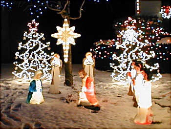 After that I got the lights on the inner shrubs on the left side of the house, and then put the 4' artificial tree onto the planter post. After that I put out the wireframe candles and drummer boys. I also "finished" the nativity under the weeping cherry tree by hanging the nativity star from the tree trunk and placing the swirl trees as a backdrop.