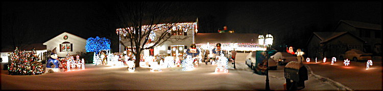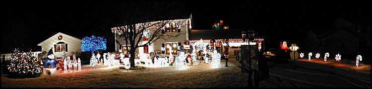 As of Monday night, the outermost candy cane along the driveway is completely buried in snow after our neighbor snowblowed his driveway, and the rocking horse is half buried in the snow. I had to disconnect the animation motors form the rocking horse and the wings on the 4 trumpeting angels since the snow was so deep they could no loner move. At least I got the decorations on the roof and on the left end of the property. I just wish I had gotten more of the wireframes up before the snow, but with the hospital emergency on Friday, I never had a chance to bring them home from work, so I didn't even have them at home to put out on Saturday or Sunday. So, unless I get some other decorations out during the week in the snow, this will be the final pre-Christmas installment. We managed to add an additional 2,375 lights today, giving us a current grand total of 20,156 lights. Still down about 8,000 from last year, but given the conditions for this year, I don't think I'll complain. I can't believe the remaining wireframes and lights on the maple tree amount to at least 8,000 lights, but there are still many things I did not get out this year.....