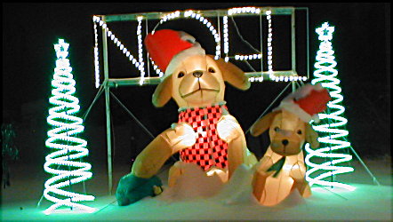 The one thing I really wanted to do was to finish off the left side of the house with the "NOEL" sign. It really looked naked with nothing on that side of the house at ground level. Marianne and I manaed to freeze and get the "NOEL" sign up. I thnk worked on the inflatable Dog & Puppy in front of the sign. Finally I got the two spiral rope light trees up to finish the display in that area.